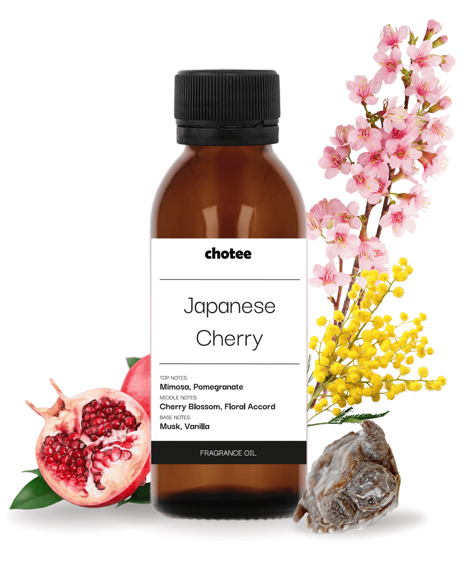 Japanese Cherry to delikatny, harmonijny zapach łączący owocową słodycz z lekko pudrowym, kwiatowym charakterem i kojącą bazą. Otwiera się nutami owoców granatu i miękką mimozą, przechodząc w subtelne, floralne serce z wyraźnym akcentem kwiatu wiśni. Finisz wanilii i piżma otula przestrzeń ciepłem, wprowadzając pozytywny, relaksujący i zmysłowy klimat.